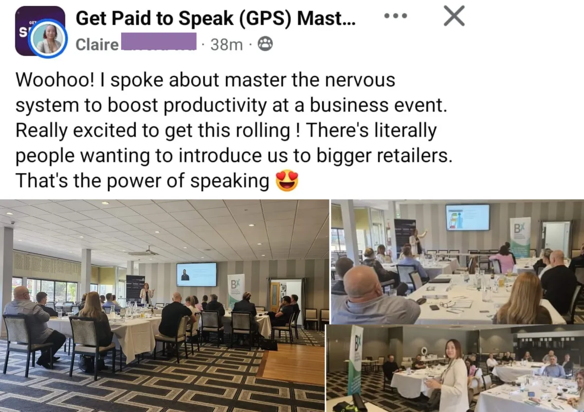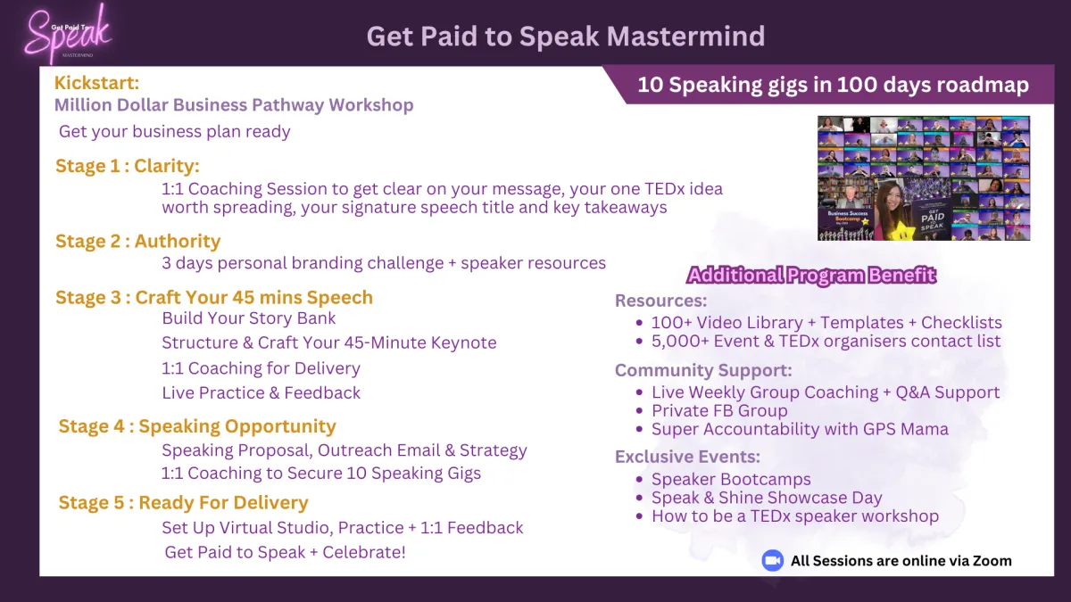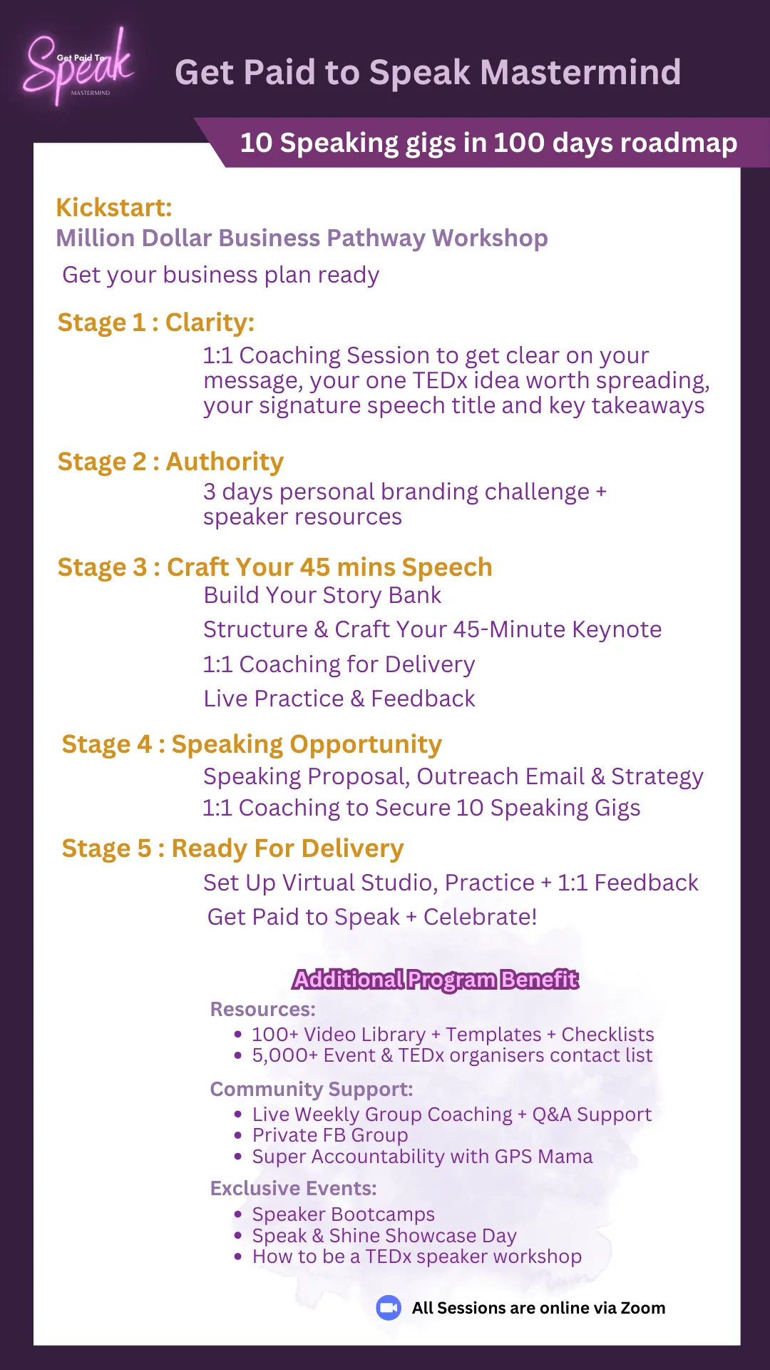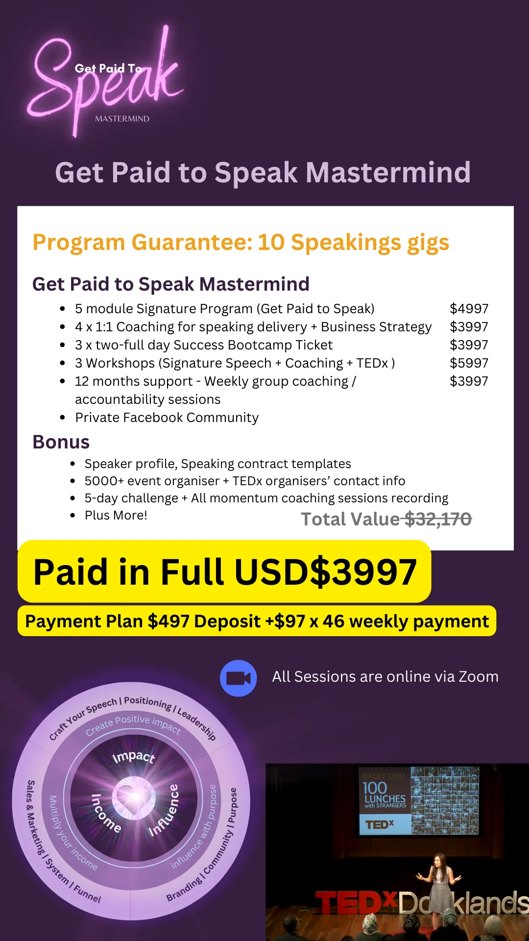 The Paid to Speak course is designed to help you build your speakers profile, put together engaging and valuable keynote speeches, and give you the templates AND contacts to get your name out there.