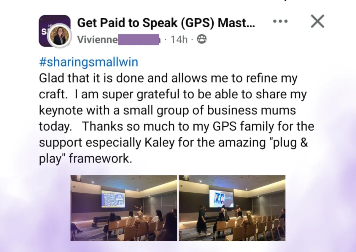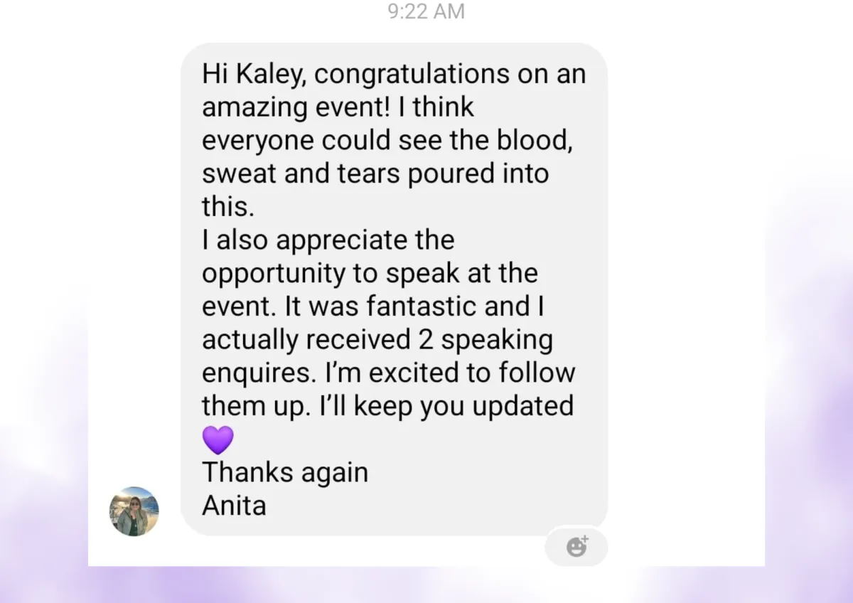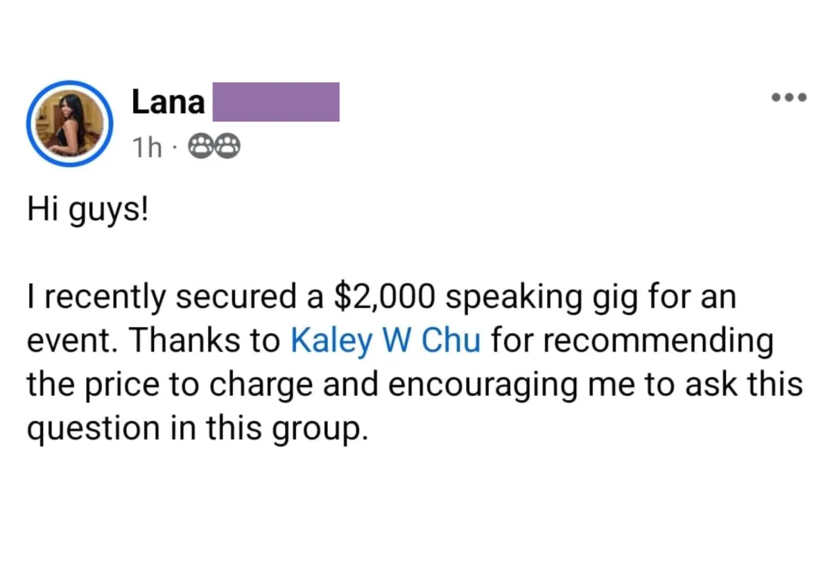 Through her training, Kaley has helped her clients earn hundreds of thousands of dollars in paid speaking gigs. In this course, you’ll have access to Kaley live, where she’ll be taking you through this course to ensure you’re ready to land that first speaking gig ASAP.