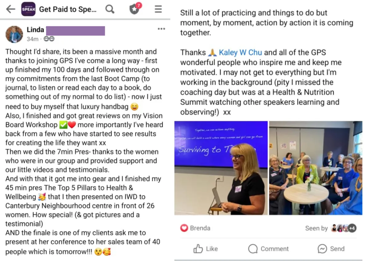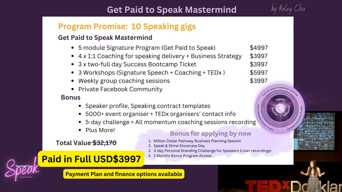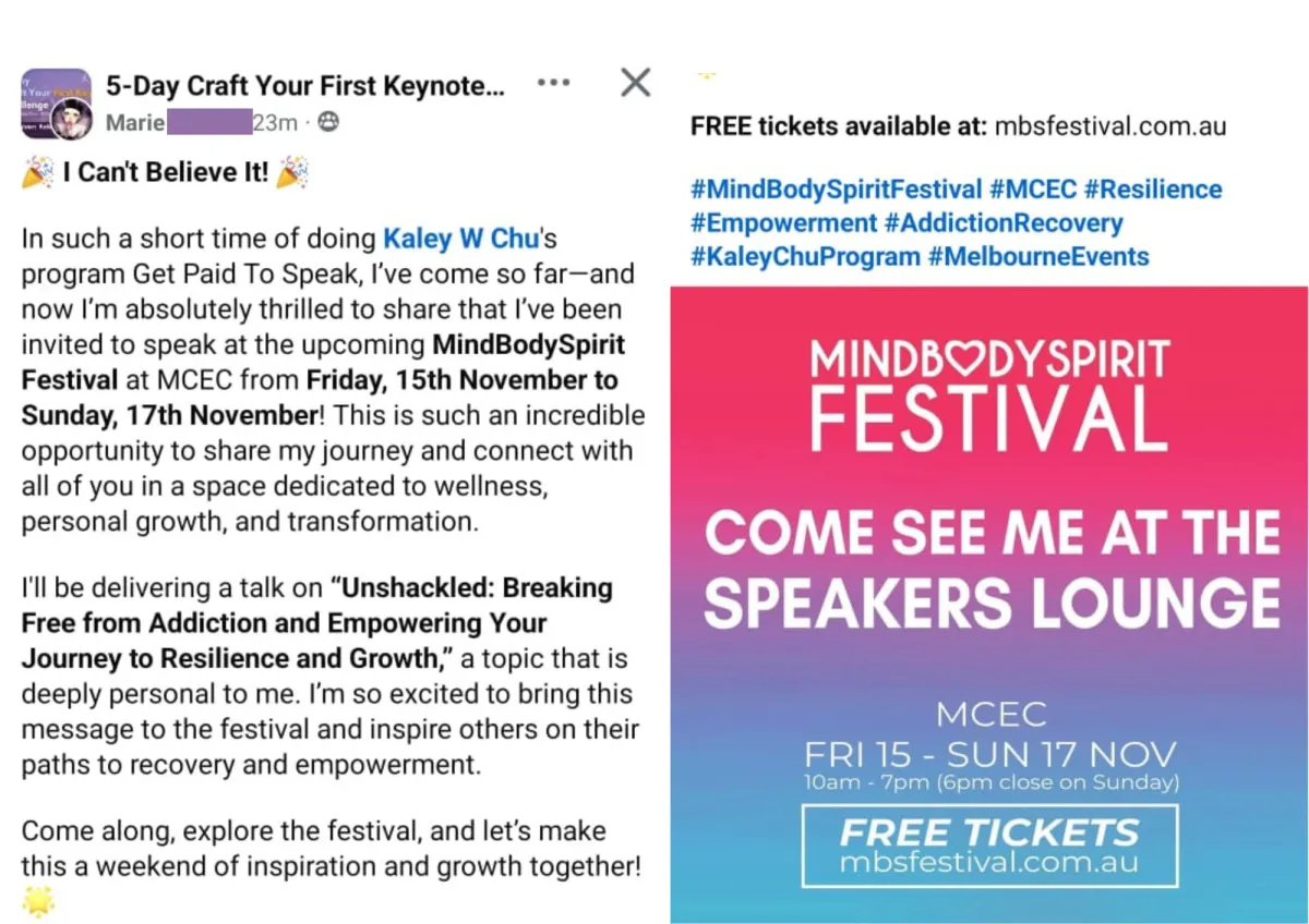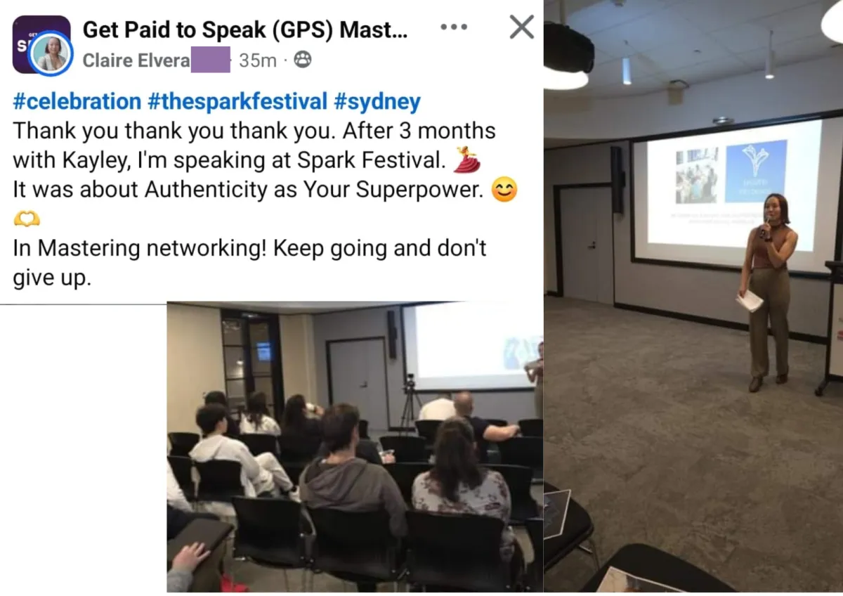 Through her training, Kaley has helped her clients earn hundreds of thousands of dollars in paid speaking gigs. In this course, you’ll have access to Kaley live, where she’ll be taking you through this course to ensure you’re ready to land that first speaking gig ASAP.
